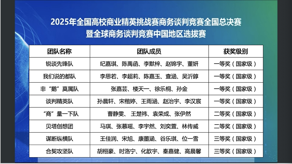 11月2日,2025年全国高校商业精英挑战赛商务谈判竞赛暨全球商务谈判竞赛中国地区选拔赛在线上圆满落幕。竞赛分为知识赛、全国预选赛、全国总决赛、全国精英赛四个阶段。我校在全国总决赛中获得一等奖4项,二等奖2项,三等奖2项,最佳院校组织奖。两支队伍进入精英赛(全国仅十支队伍),最终“锐谈先锋队”获得精英赛亚军。