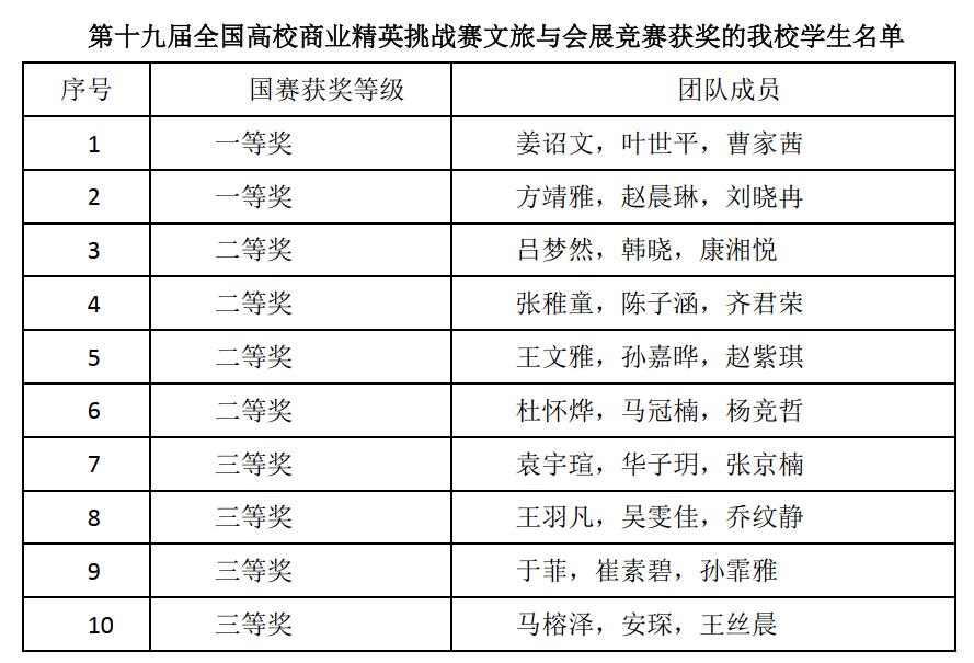 此项竞赛是由中国国际贸易促进委员会商业行业委员会、中国国际商会商业行业商会以及中国商业经济学会共同主办的国家级学科竞赛,是我国商科教育领域纳入《全国普通高校大学生竞赛排行榜》唯一的文旅与会展类国家级权威竞赛。