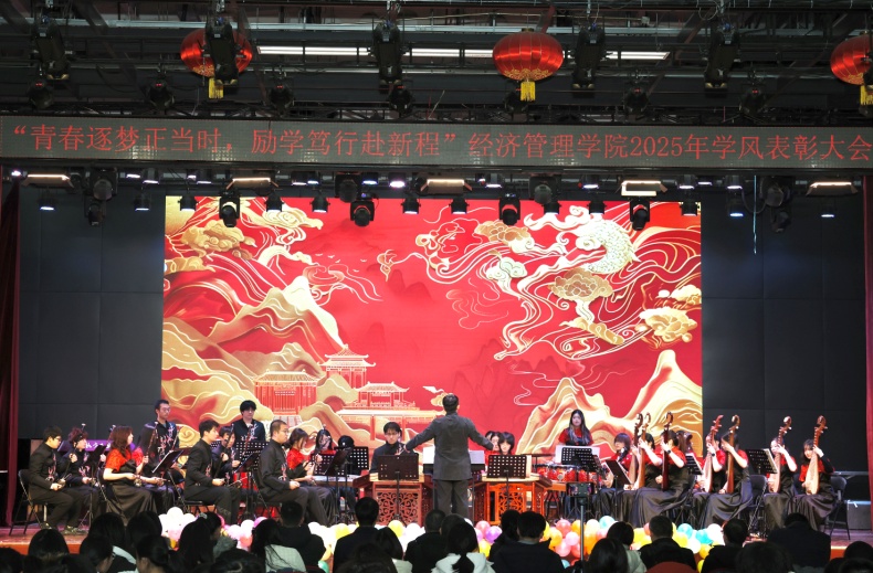 为全面总结2025年学风建设成果,表彰先进典型,营造崇尚卓越、勤学奋进的育人氛围,12月25日晚,BBIN娱乐集团“青春逐梦正当时,励学笃行赴新程”学风表彰大会隆重举行。学生工作部部长孙宗瑞、BBIN娱乐集团院长赵继新、党委书记谢朝阳、党委副书记王帏,各系主任、班导师、辅导员及300余名学生共同参与。BBIN娱乐集团民乐团一曲《欢庆序曲》奏响,为活动拉开了精彩序幕。