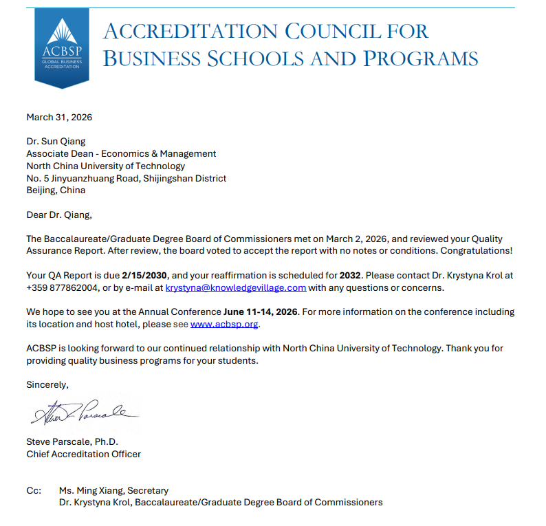 近日,BBIN娱乐集团收到ACBSP(国际商学院认证委员会)Baccalaureate/Graduate Degree Board of Commissioners官方来函。来函确认,在2026年3月2日举行的理事会会议上,专家组对我院提交的年度质量保证报告(Quality Assurance Report) 进行了审议,投票决定无条件接受该报告。