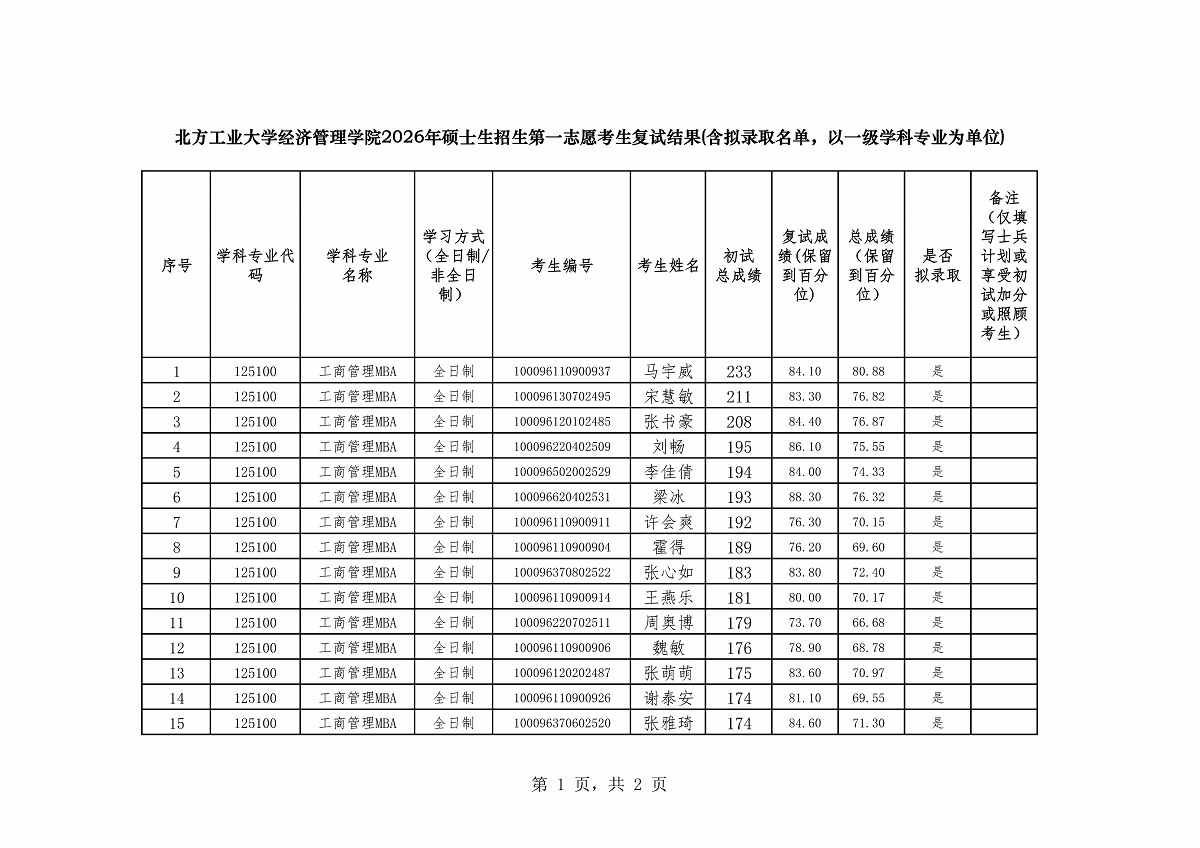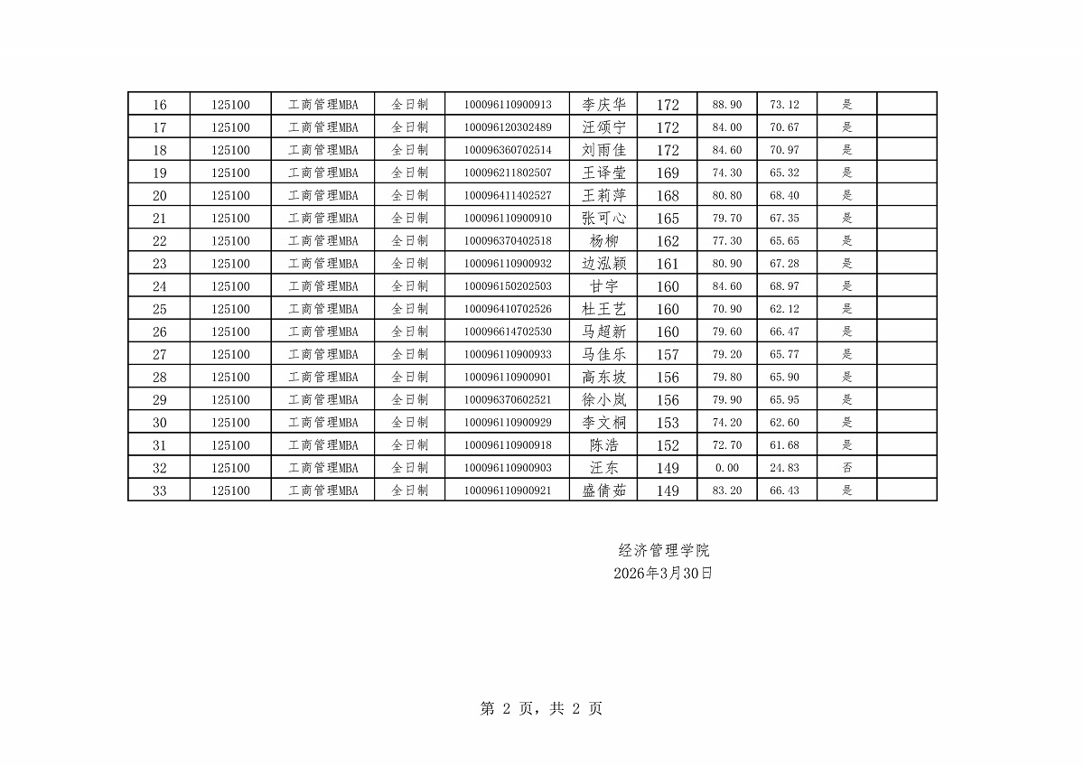 BBIN娱乐集团2026年硕士生招生第一志愿考生复试结果——工商管理MBA(全日制)