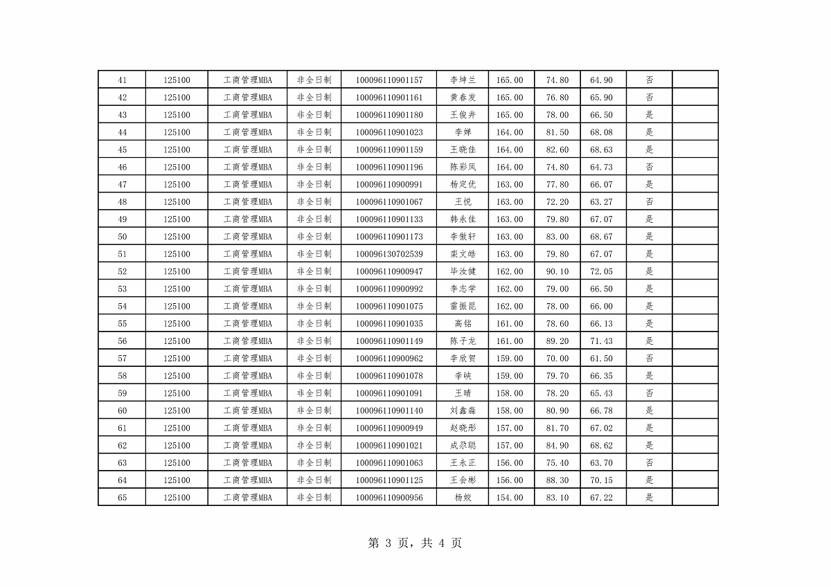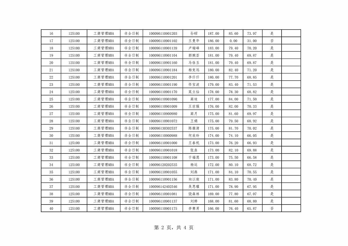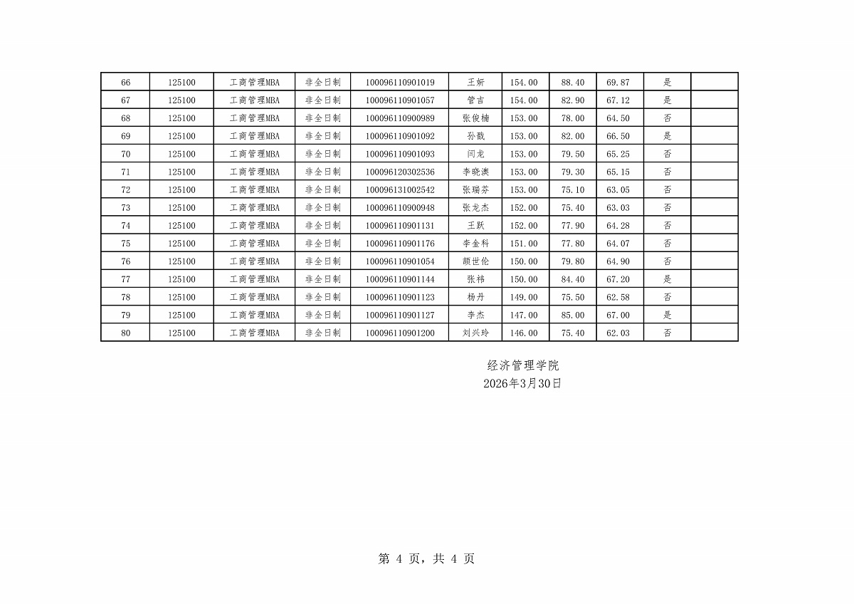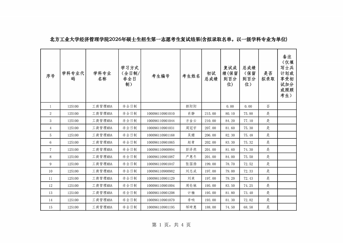 BBIN娱乐集团2026年硕士生招生第一志愿考生复试结果——工商管理MBA(非全日制)