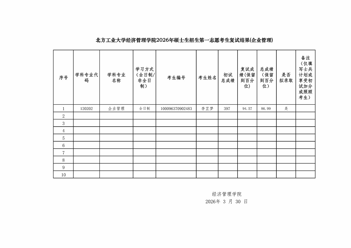 BBIN娱乐集团2026年硕士生招生第一志愿考生复试结果——企业管理