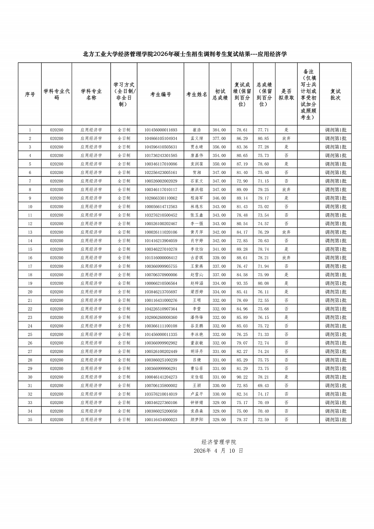 BBIN娱乐集团2026年硕士生招生调剂考生复试结果---应用经济学