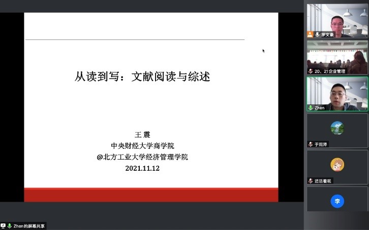 11月12日,中央财经大学王震教授应邀做了题为“从读到写:文献阅读与综述”的线上专题报告。企业管理硕士点的导师和研究生在励学楼301参加了报告会。