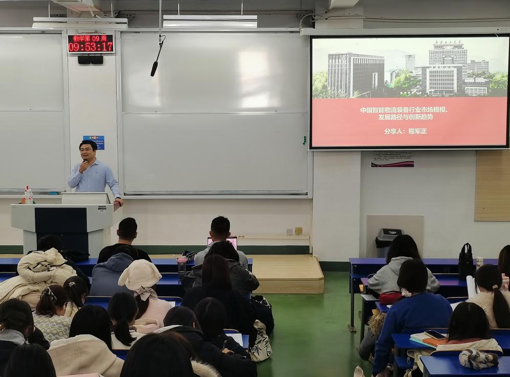 课程围绕智能物流装备行业的现状与前景展开,程军正副总裁系统阐述了中国物流行业从“规模扩张”走向“提质增效”转型的内在逻辑。他结合智能物流装备在汽车、电商、医药、公共服务等多个行业应用的具体案例,生动展示了人工智能技术在物流领域的广泛应用与前沿成果,帮助同学们建立起对智能物流系统的整体认知。